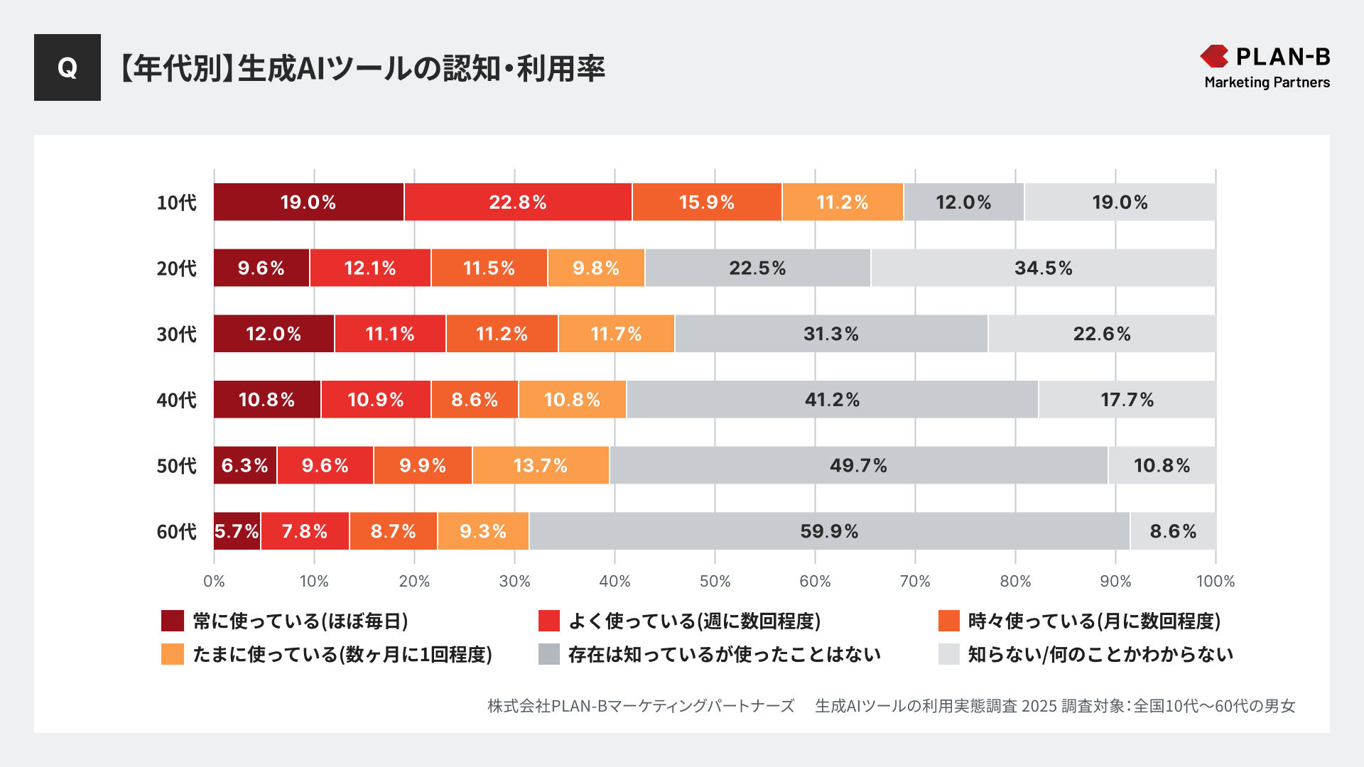株式会社ADKホールディングスと株式会社PLAN-Bが設立したジョイントベンチャー、株式会社PLAN-Bマーケティングパートナーズ(東京都品川区、代表取締役:鳥居本 真徳)は、全国の10代〜60代の男女4,000名を対象に「生成AIツールの利用実態調査」を実施しました。