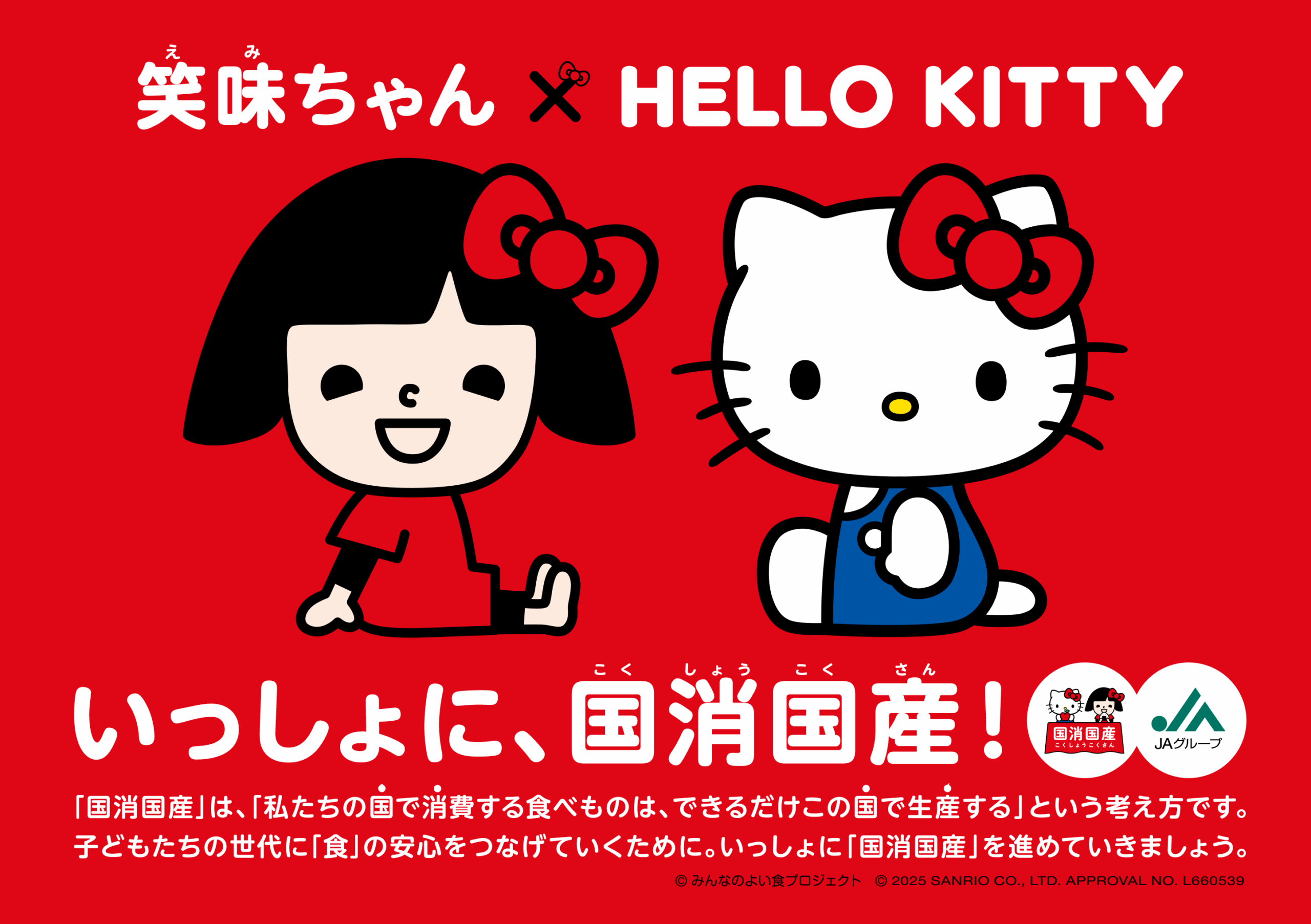 2008年にJAグループさんの「みんなのよい食プロジェクト」を立ち上げた際に、オリジナルキャラクターの「笑味(えみ)ちゃん」をデザインしました。笑味ちゃんは、日本の農家の方々が愛情を込めて作ってくださる農畜産物を、みんなで美味しく食べることを伝えるキャラクターです。今では50ポーズ以上に増え、2025年から、世界的キャラクターであるハローキティとのコラボレーションを開始し、世界中から愛される存在のキティちゃんと一緒に、日本の農畜産物をさらに応援していきます。日本の農畜産物のファンをどんどん増やしていきたい、そんな想いが込められています。