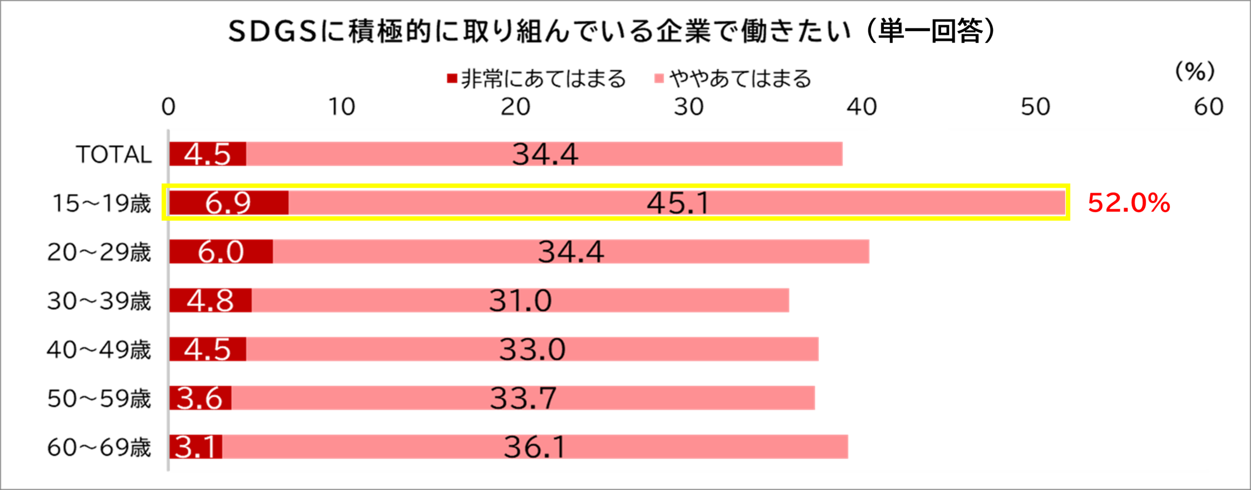 中野:SDGsの認知率は20年から22年にかけて急上昇。22年以降は80%以上の高水準を維持しています。認知率は全年代で高水準ですが、特に注目すべきは就職意向です。「SDGsに積極的な企業で働きたい」と回答した割合は、10代が飛び抜けて高く、52%と半数を超えています。