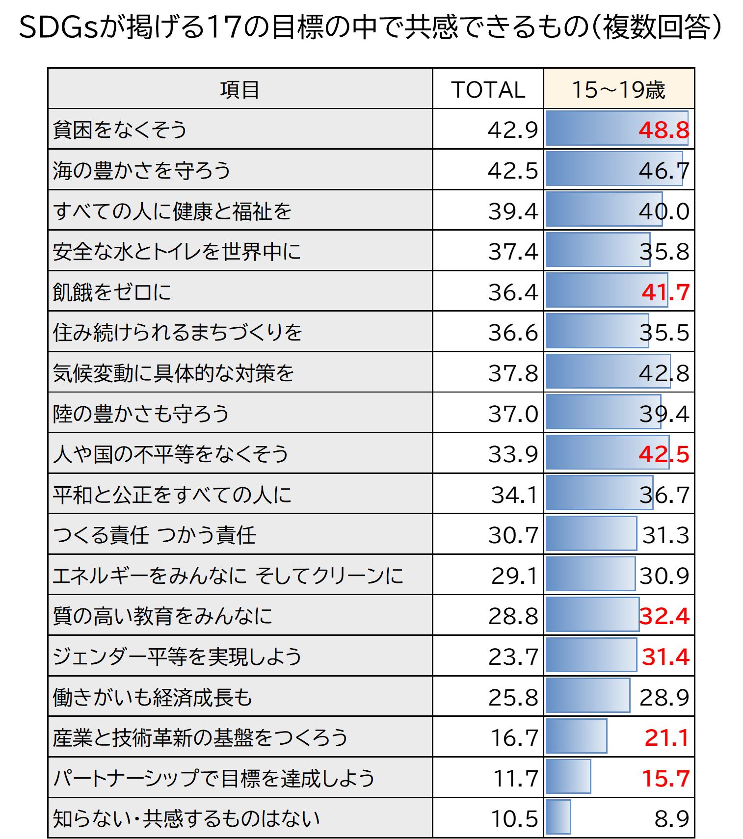 中野:また、SDGsの17の目標について共感度を調査したところ、10代においては、7つの項目で共感度が高いという傾向が見られました。特に10代の共感度が高いのは、「貧困をなくそう」「人や国の不平等をなくそう」「飢餓をゼロに」「質の高い教育をみんなに」「ジェンダー平等を実現しよう」といった、社会における不平等の解消に関する目標です 。これは、他の年代に比べ、10代が、自分たちが日々暮らす社会での「公平性」に対して、意識・関心が高いとも言える結果です。