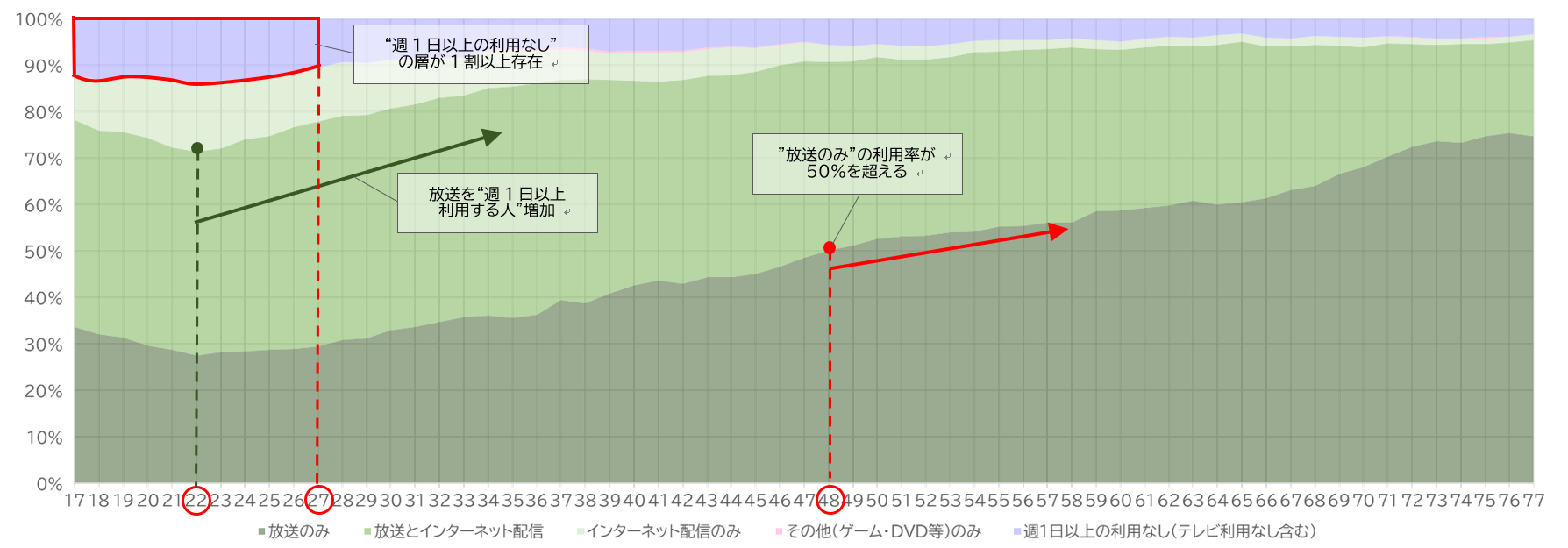 Z世代*1と重なる27歳以下では、放送・インターネット配信を問わず、“週1日以上の利用なし”の層が1割以上存在しており、団塊ジュニア世代*2に差し掛かる48歳で、”放送のみ”の利用率が50%を超える結果となりました。