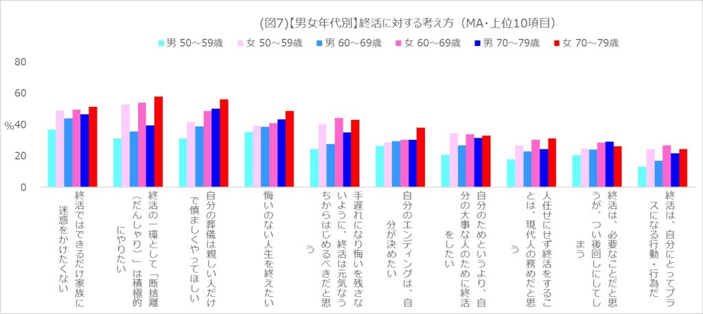 また、終活に対する考え方について、全32項目の中から当てはまるものを聞いたところ、「断捨離」への積極性と「元気なうちから始めるべき」という先取り意識において、大きな男女差が見られました。(図7)